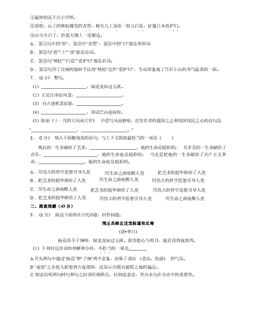 初中 七年级(上)语文期末试卷2-1卷部编版