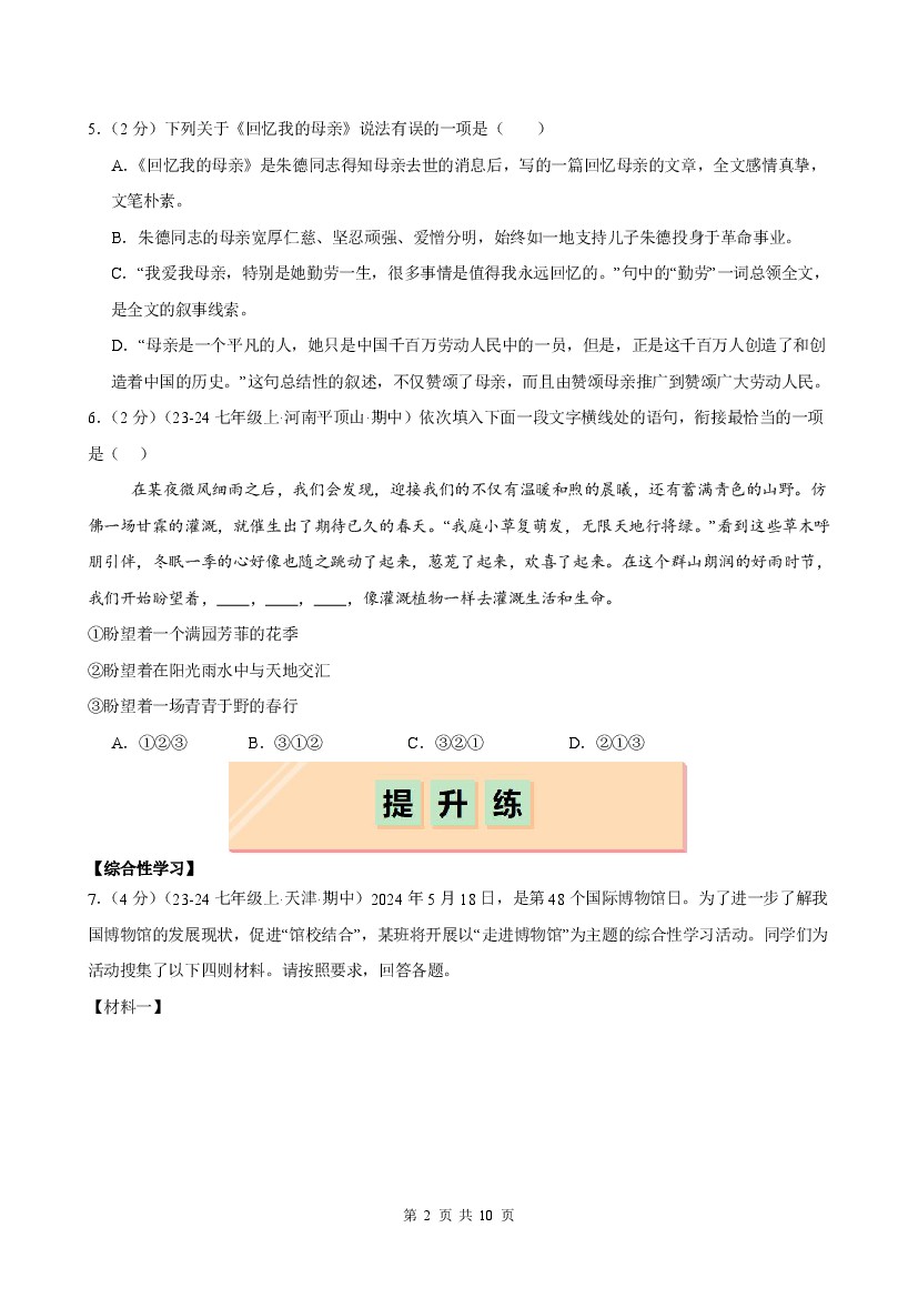 首页 > 全部 > 课时练习 > 25秋七年级上册语文同步练习第14课 《回忆我的母亲》(分层作业)(原卷版)