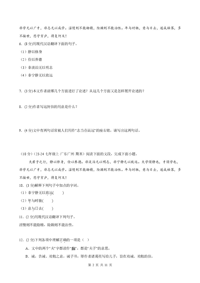 初中 25秋七年级上册语文同步练习第16课 《诫子书》(分层作业)(原卷版)