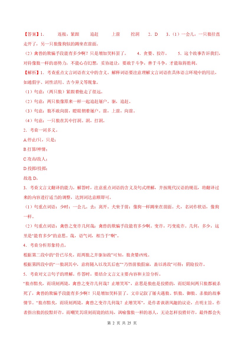 25秋七年级上册语文同步练习第20课 《狼》(分层作业)(解析版)