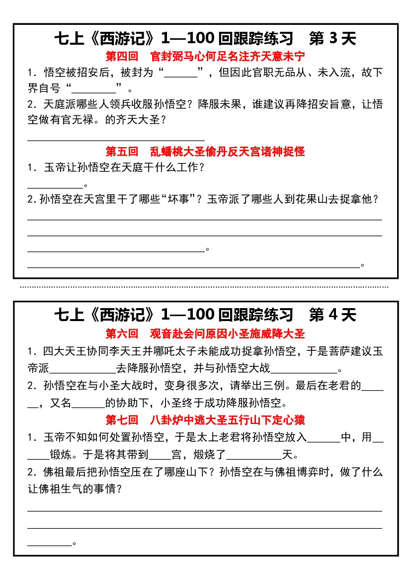 七年级上册语文《西游记》1—100回跟踪练习小纸条