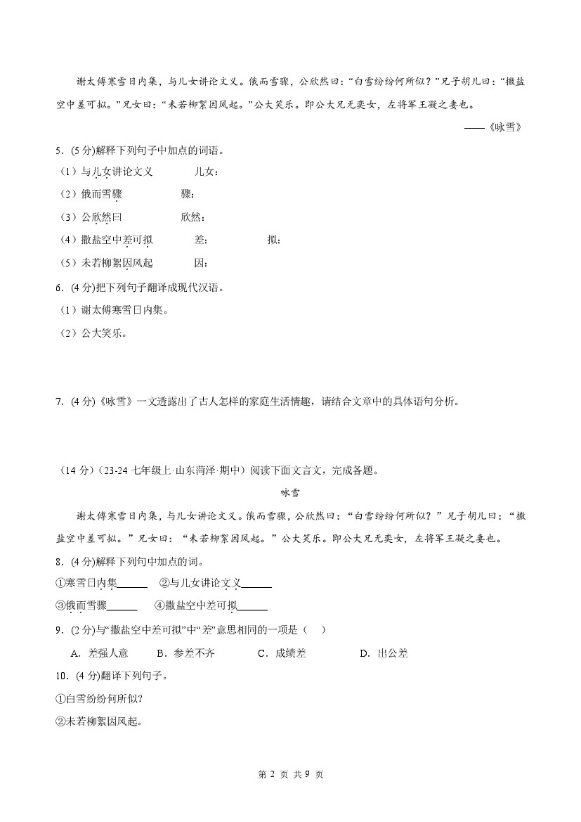 初中 25秋七年级上册语文同步练习第8课 《咏雪》(分层作业)(原卷版)