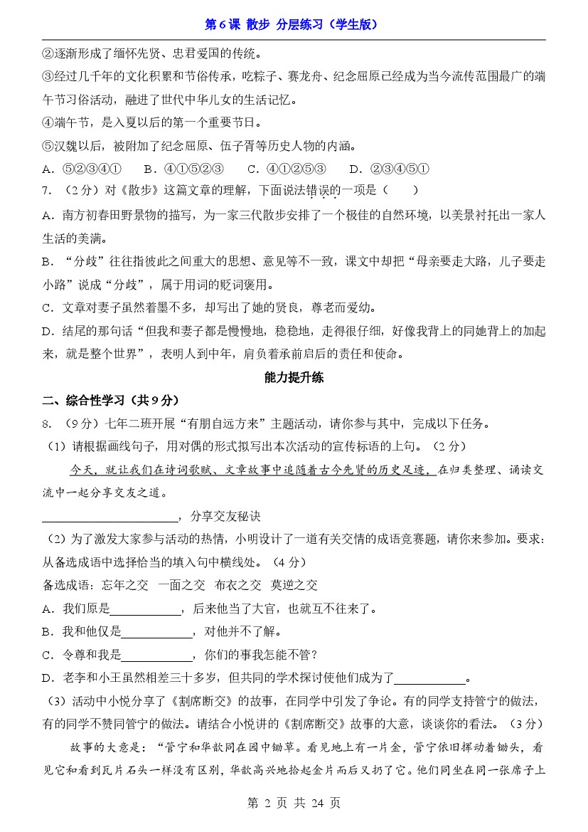 初中 25年七上第6课 散步(分层练习)