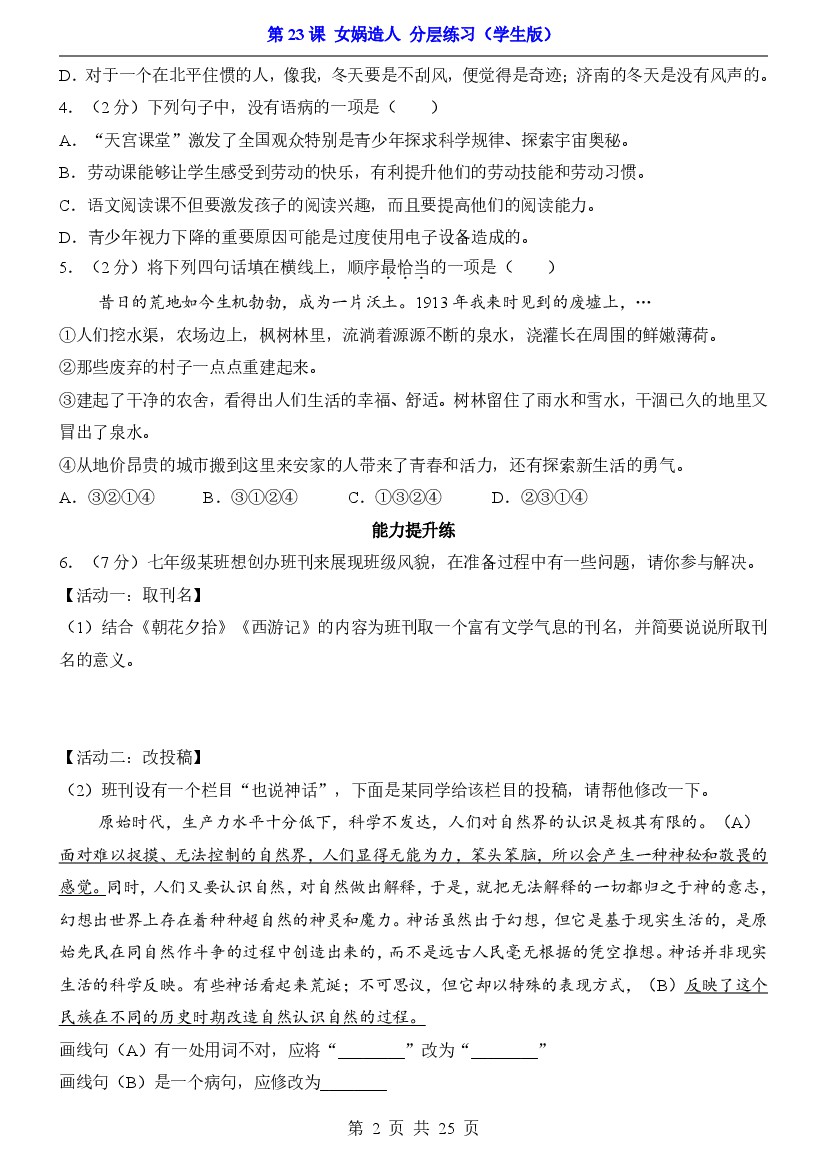 首页 > 全部 > 课时练习 > 25年七上第23课 女娲造人(分层练习)