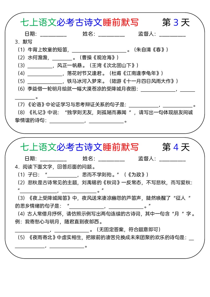 初中 七上必考古诗文睡前默写54天(暑假提前预习)