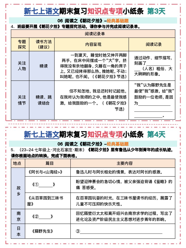 整书阅读新七上语文期末复习知识点专项小纸条(暑假提前预习)
