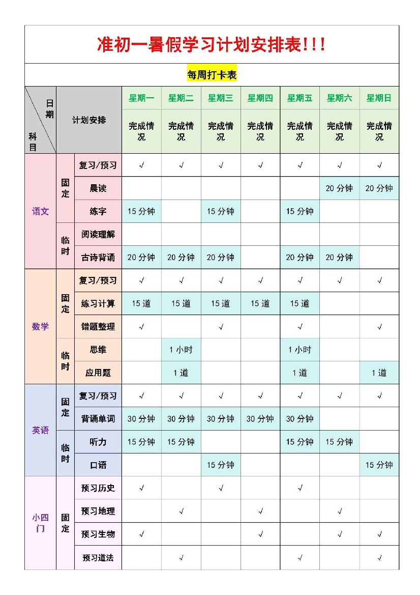 初中 准初一暑假学习计划安排表!!!