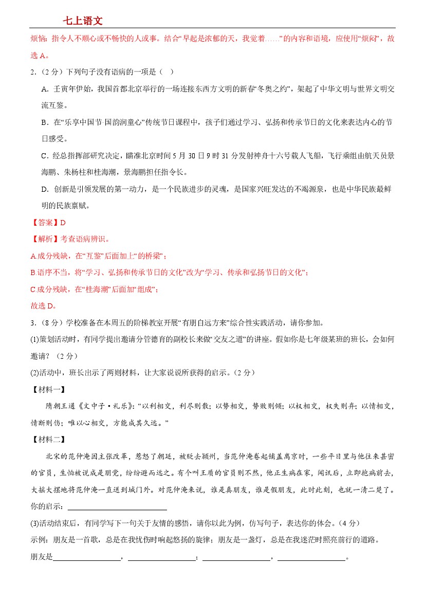 初中 【七上语文】第二单元【2025版单元检测】(A卷•知识通关练)(解析版)