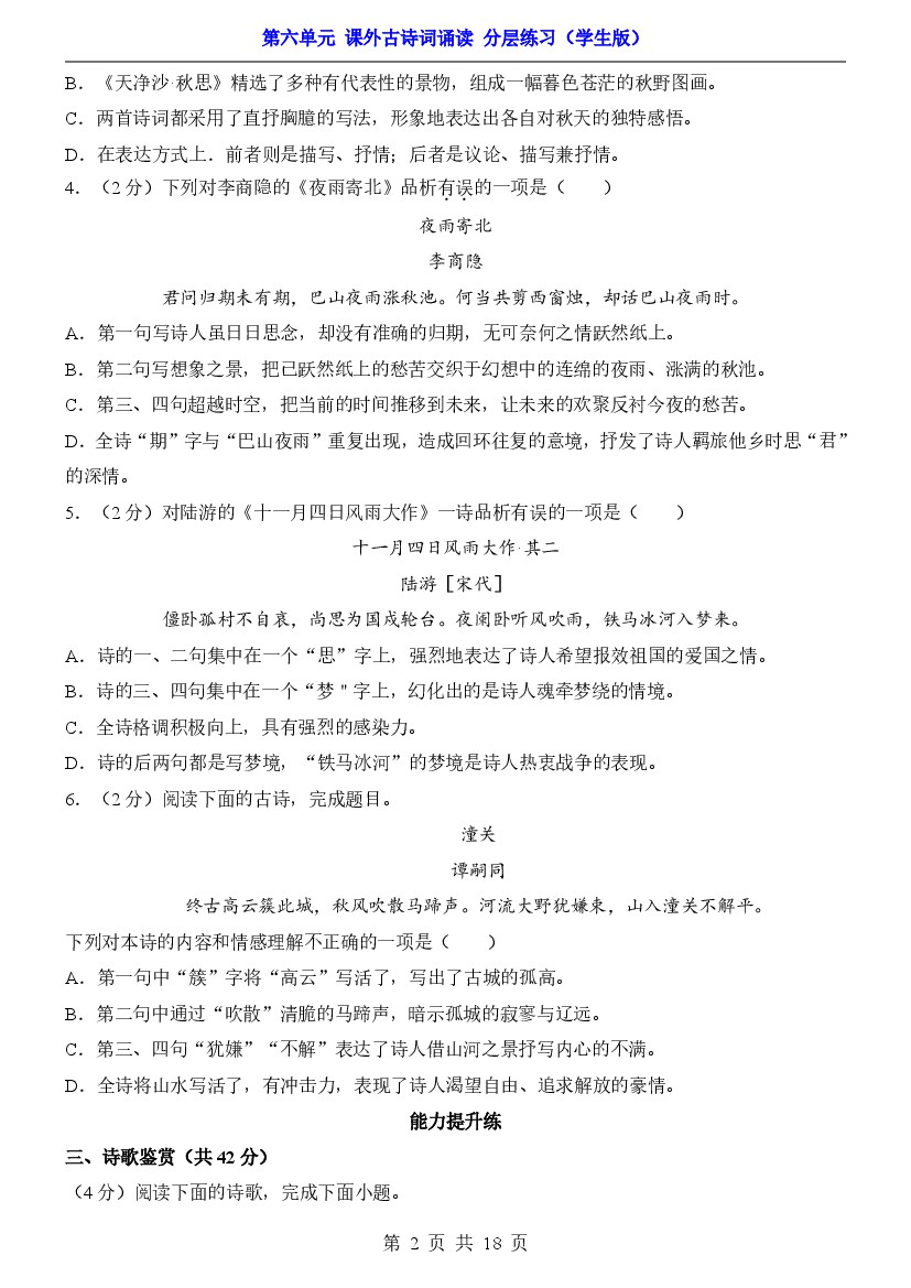 首页 > 全部 > 单元测试 > 七上第六单元 课外古诗词诵读(分层练习)