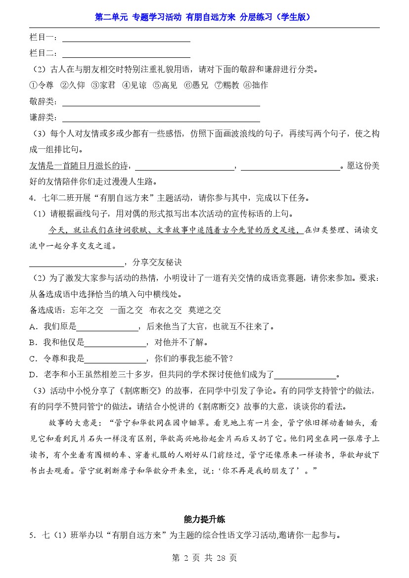 初中 七上第二单元 专题学习活动 有朋自远方来(分层练习)