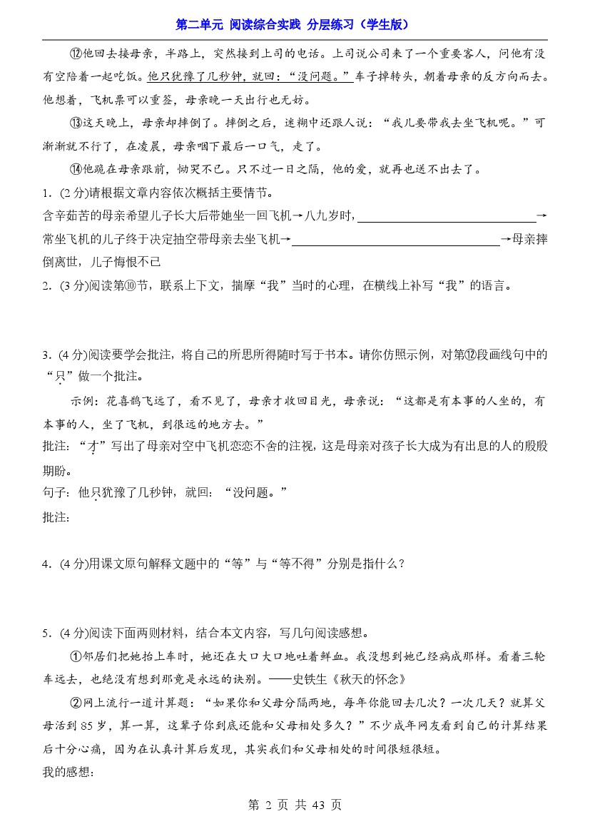 七上第二单元 阅读综合实践(分层练习)