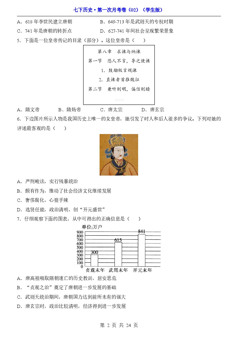 2025年七下历史第一次月考试卷7下历史第1次月考02【第1-7课】