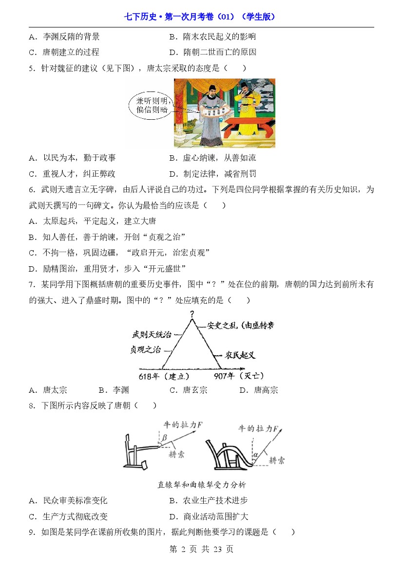 2025年七下历史第一次月考试卷7下历史第1次月考01【第1-7课】