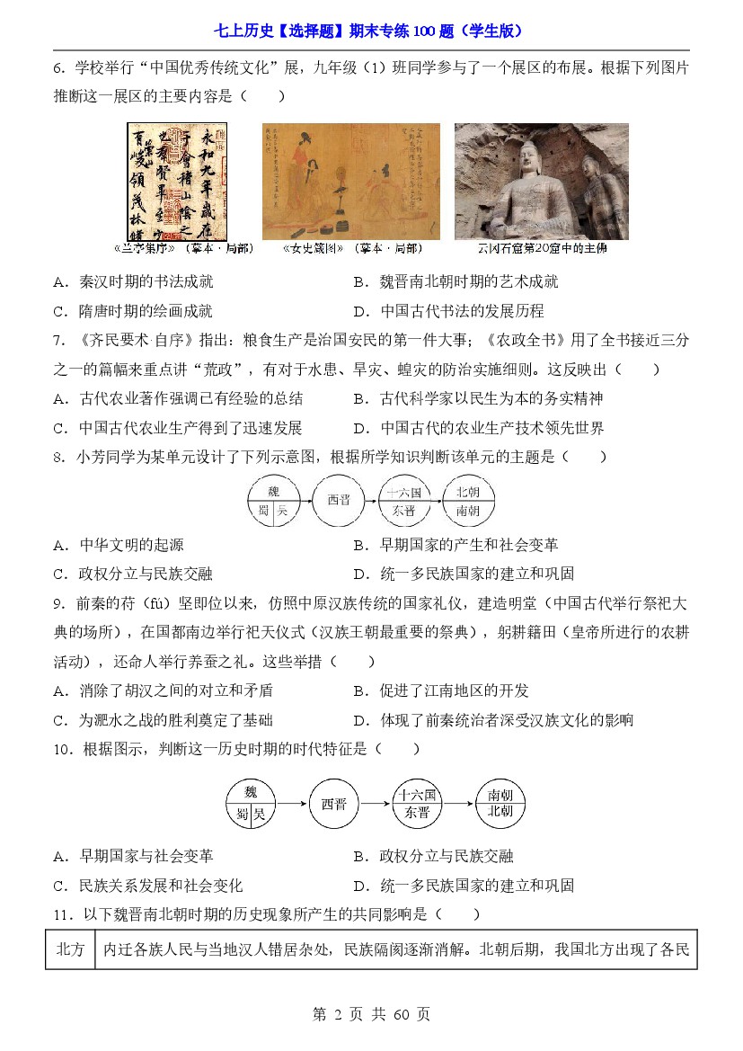 初中 七上历史【选择题】期末专练100题(暑假提前练习)