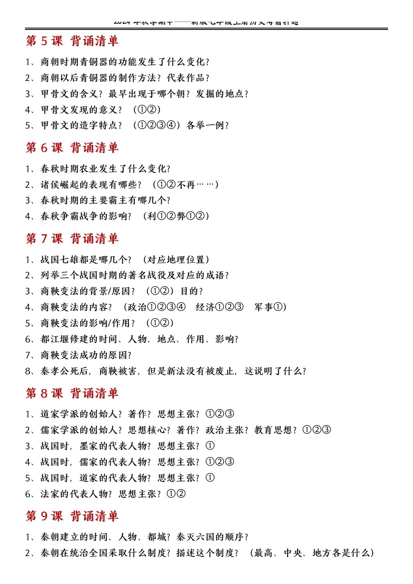 (暑假提前预习)新七上历史期中1-10课重点背诵清单