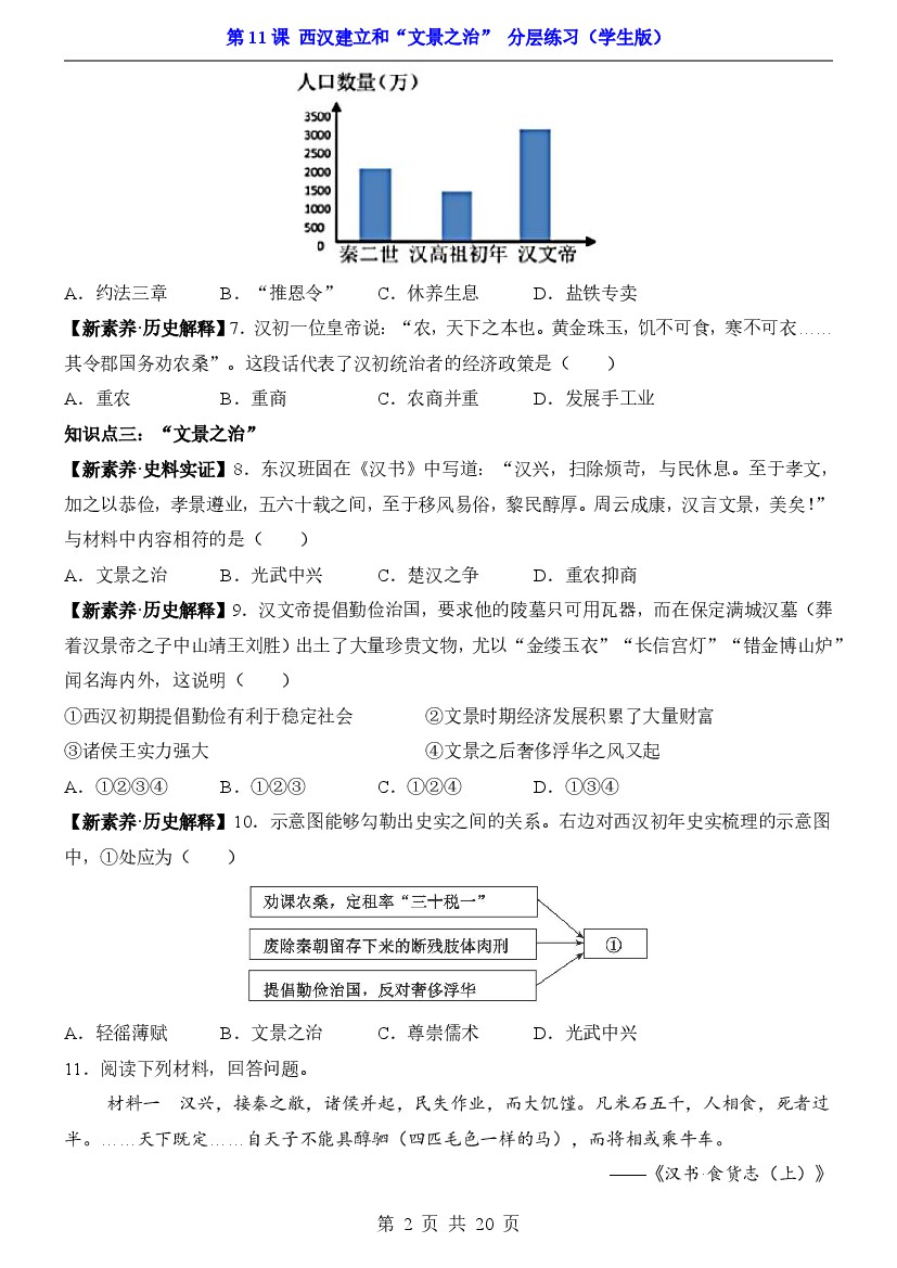 初中 七上历史统编版第11课 西汉建立和“文景之治”(分层练习)