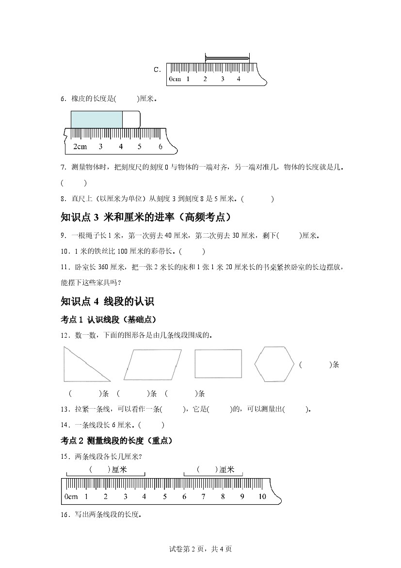 小学 2025秋人教版二年级上册数学第四章 厘米和米考点考题点点通