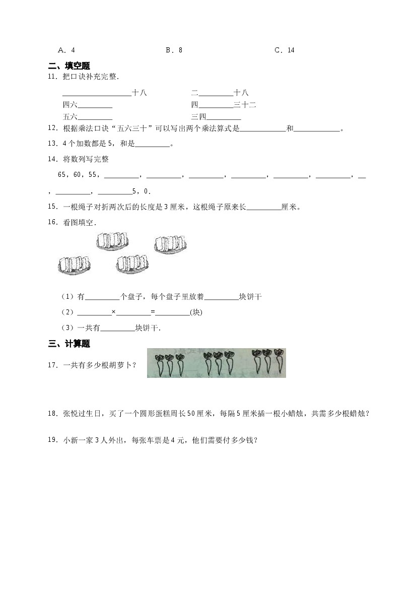首页 > 全部 > 单元测试 > 北师大版二年级上册第四单元《乘法口诀(一)》单元检测卷(含答案)
