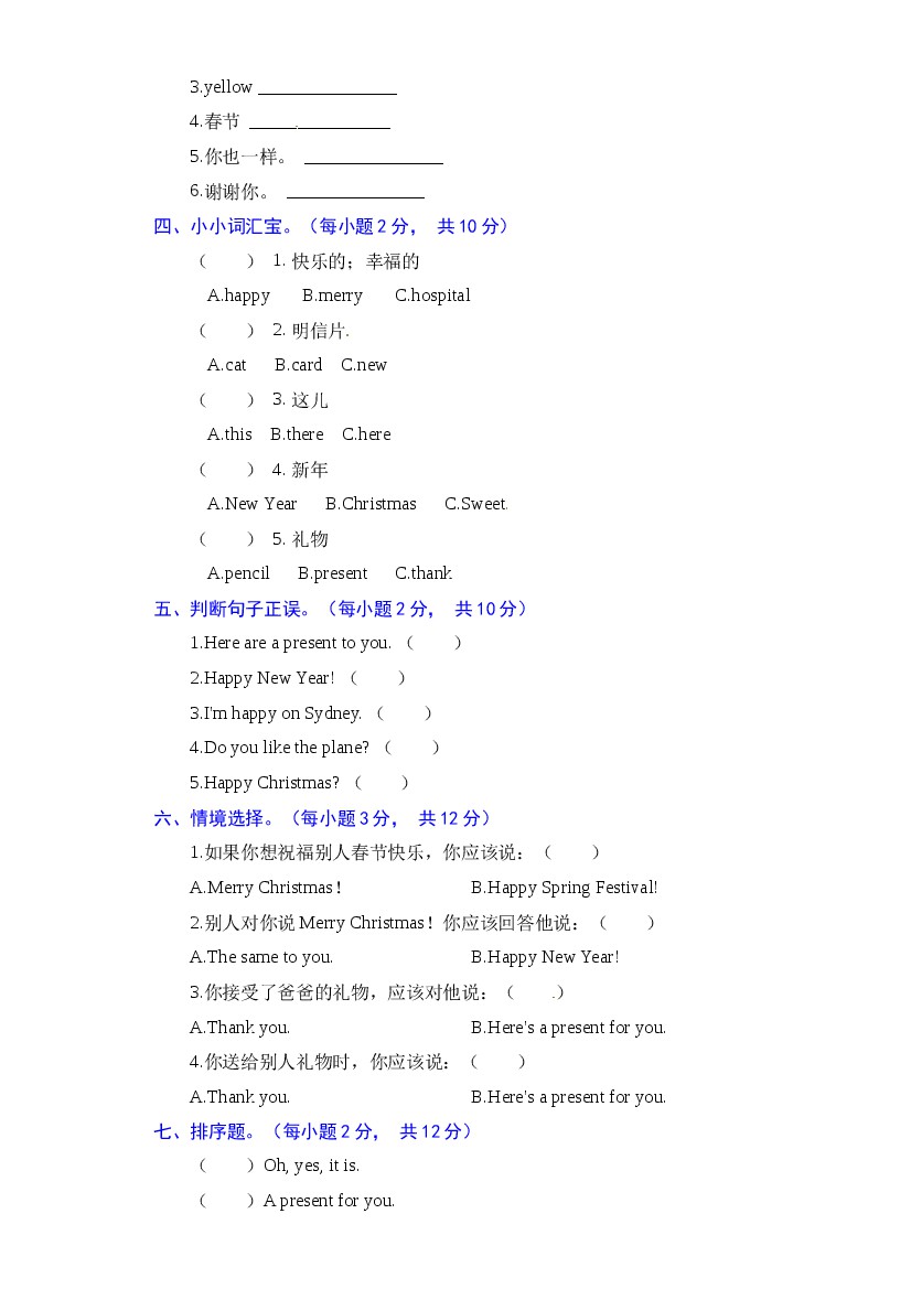 首页 > 全部 > 单元测试 > 人教版二年级上册英语 第六单元能力提升卷-Unit 6 Happy holidays(含答案)