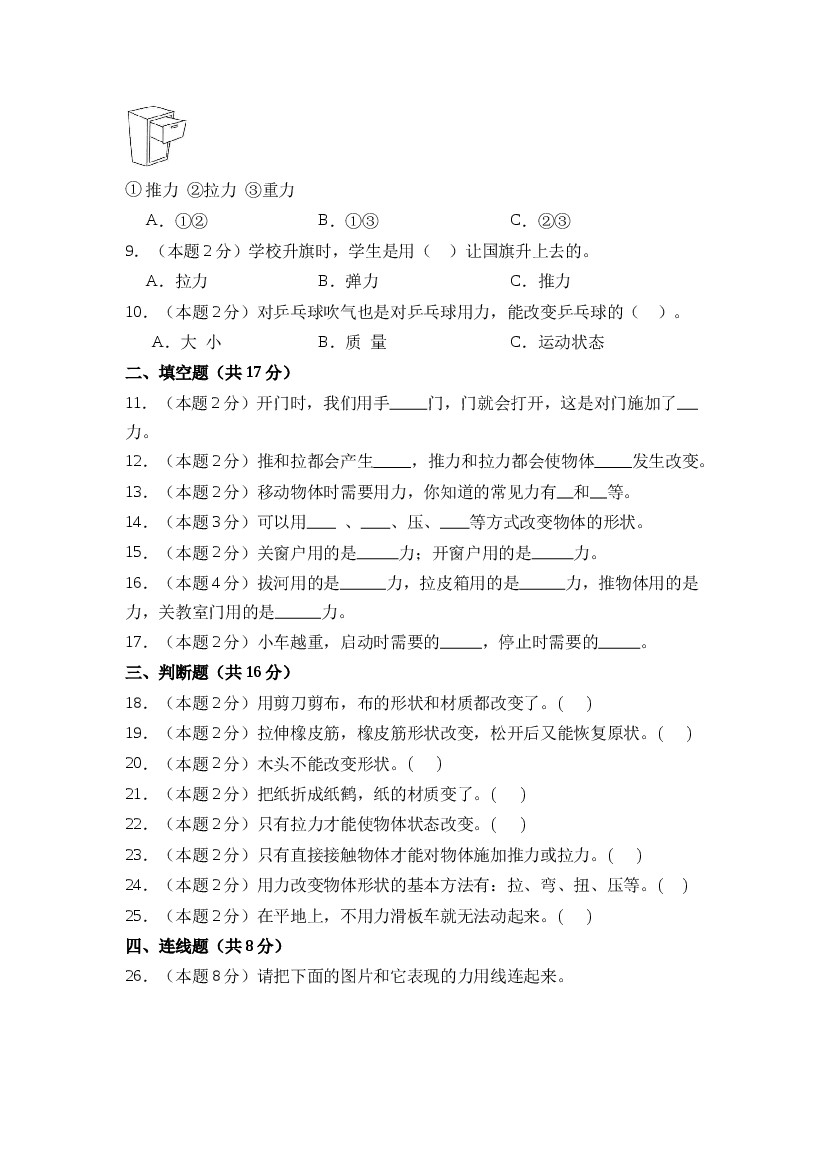 小学 25年秋二上科学(苏教版)第三单元 常见的力(单元测试) A4版