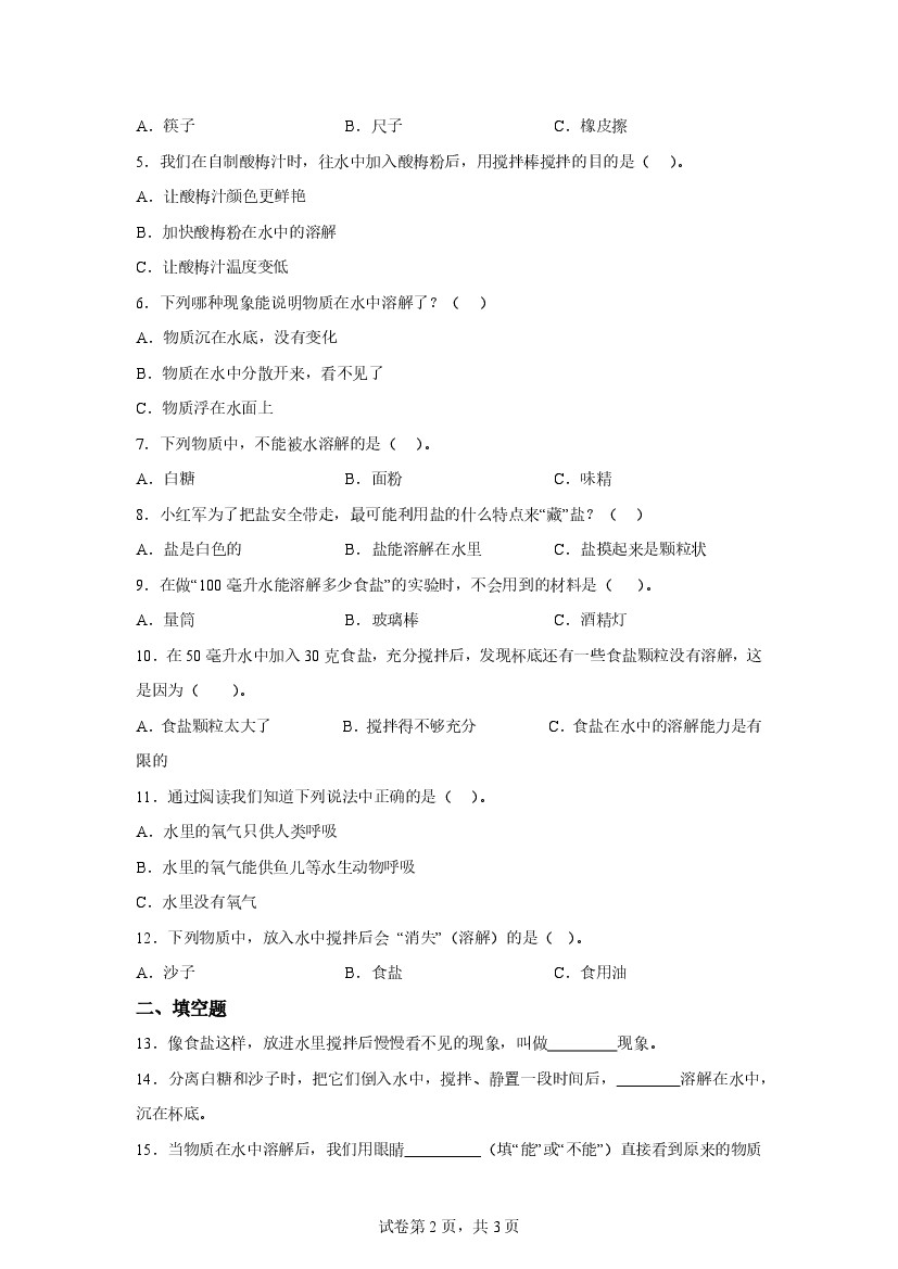 首页 > 全部 > 专项练习 > 第一单元 溶解(期中专项训练)二年级科学上学期(大象版·新教材)