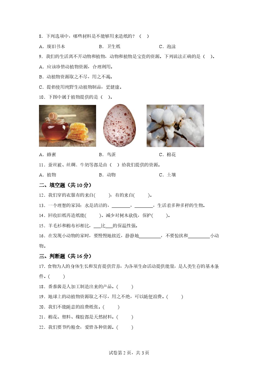 小学 第三单元 大自然的礼物(单元测试)科学青岛版五四制二年级上册(新教材)