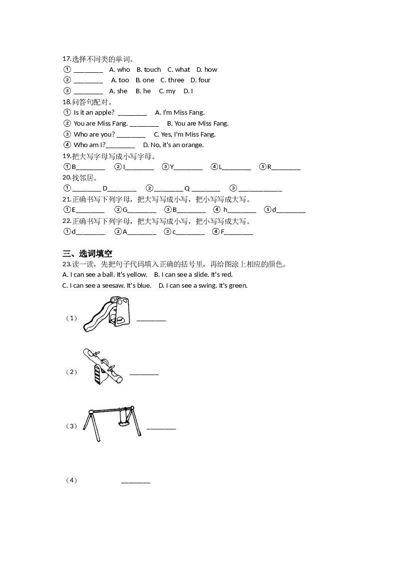 首页 > 全部 > 单元测试 > Unit 7 In the playground(同步练习)-二年级英语上册-沪教牛津版(深圳用)(含答案)