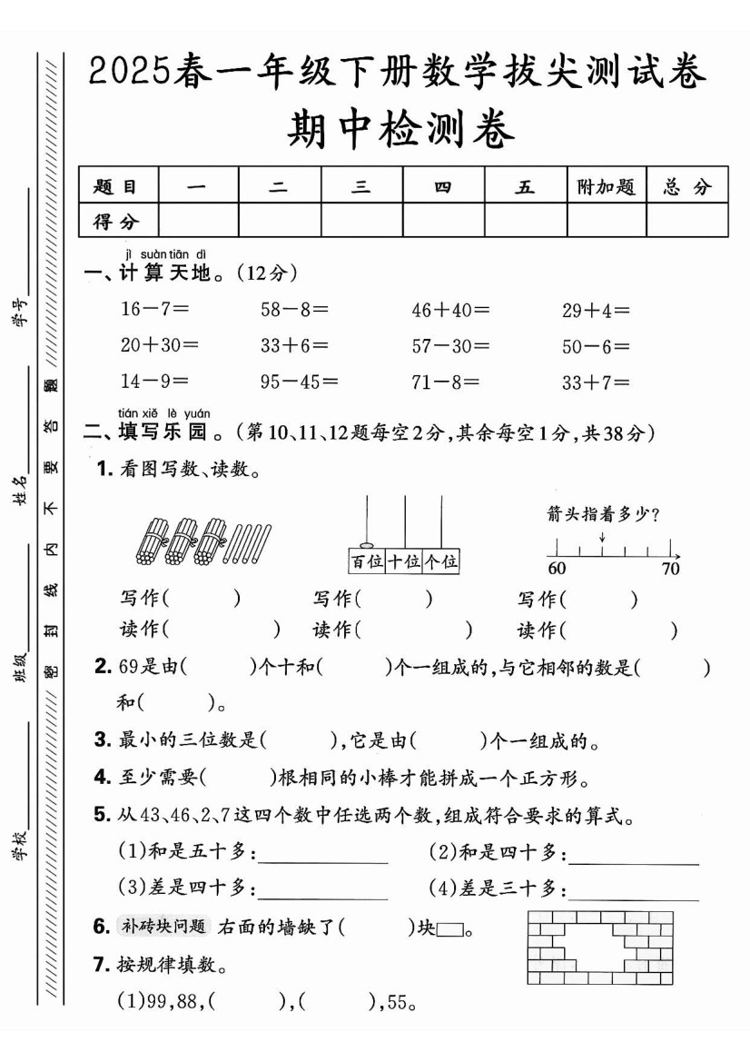 一年级(下)数学期中押题卷5套《人教》