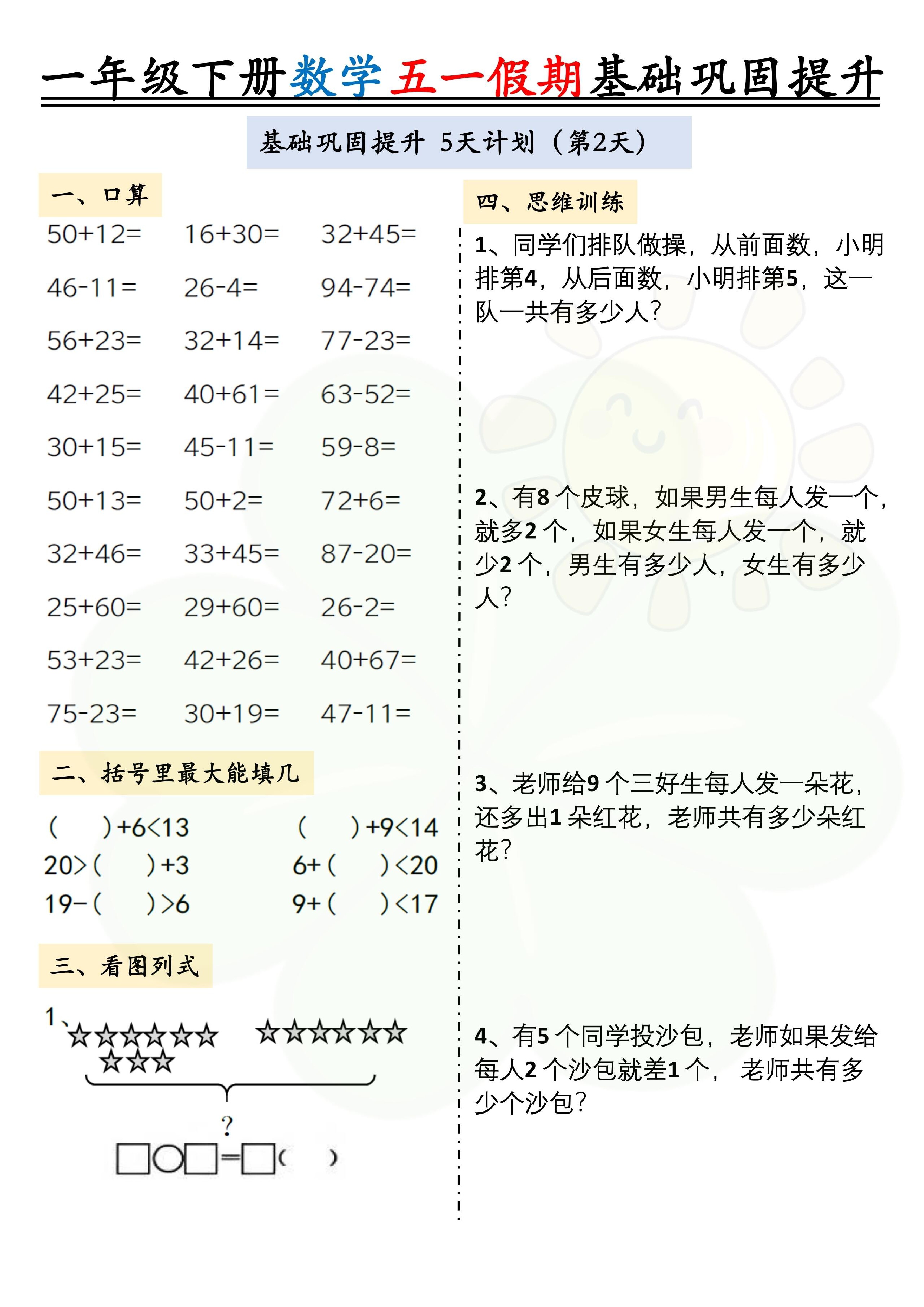 一年级(下)数学五一假期作业两套(10页)基础巩固提升