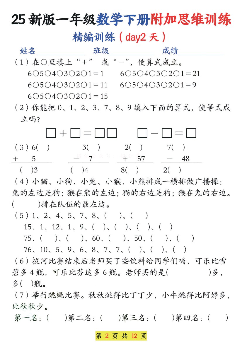 小学 一年级(下)数学附加思维训练(精编训练12天)含答案24页