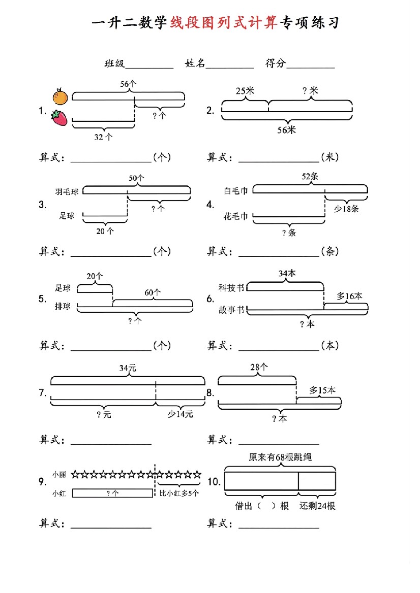 首页 > 全部 > 专项练习 > 一升二数学线段图列式计算专项练习