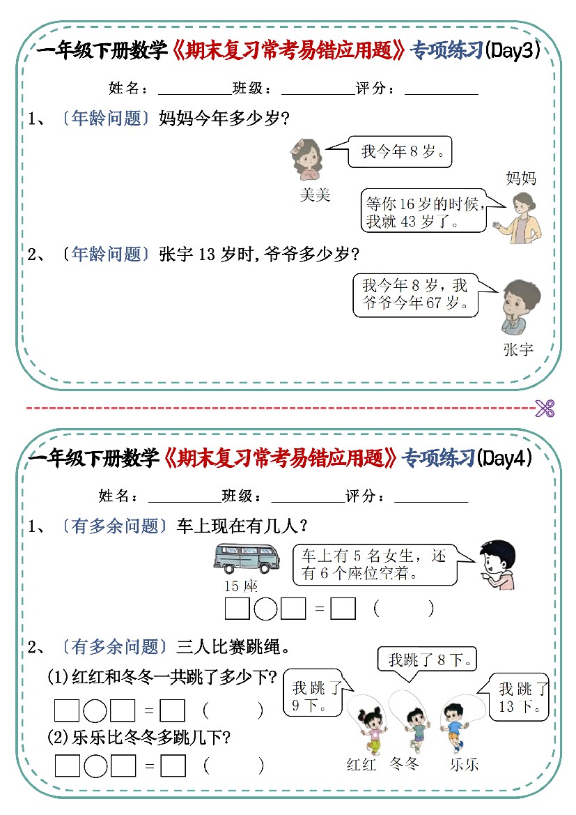 一年级下册数学《期末复习常考易错应用题》专项练习8天