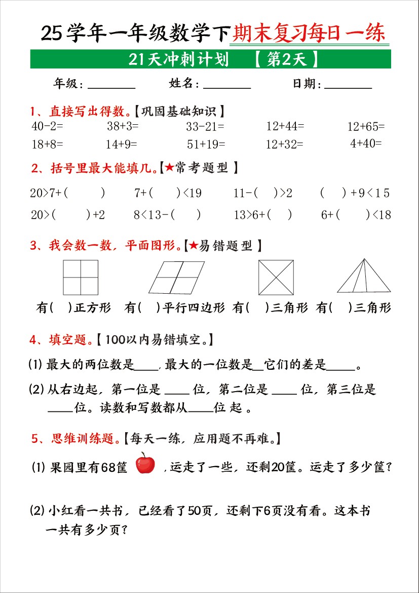 一年级下册数学期末复习21天冲刺