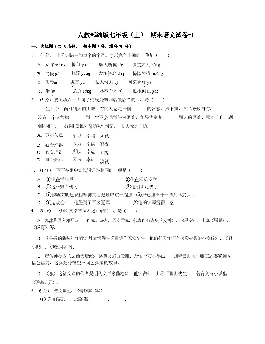 七年级(上)语文期末试卷5-1卷人教部编版