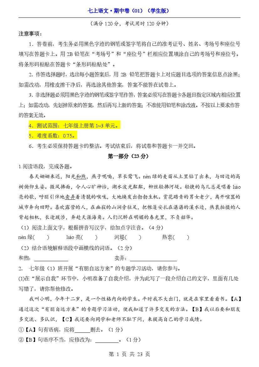 七年级(上)语文期中试卷1-2卷部编版