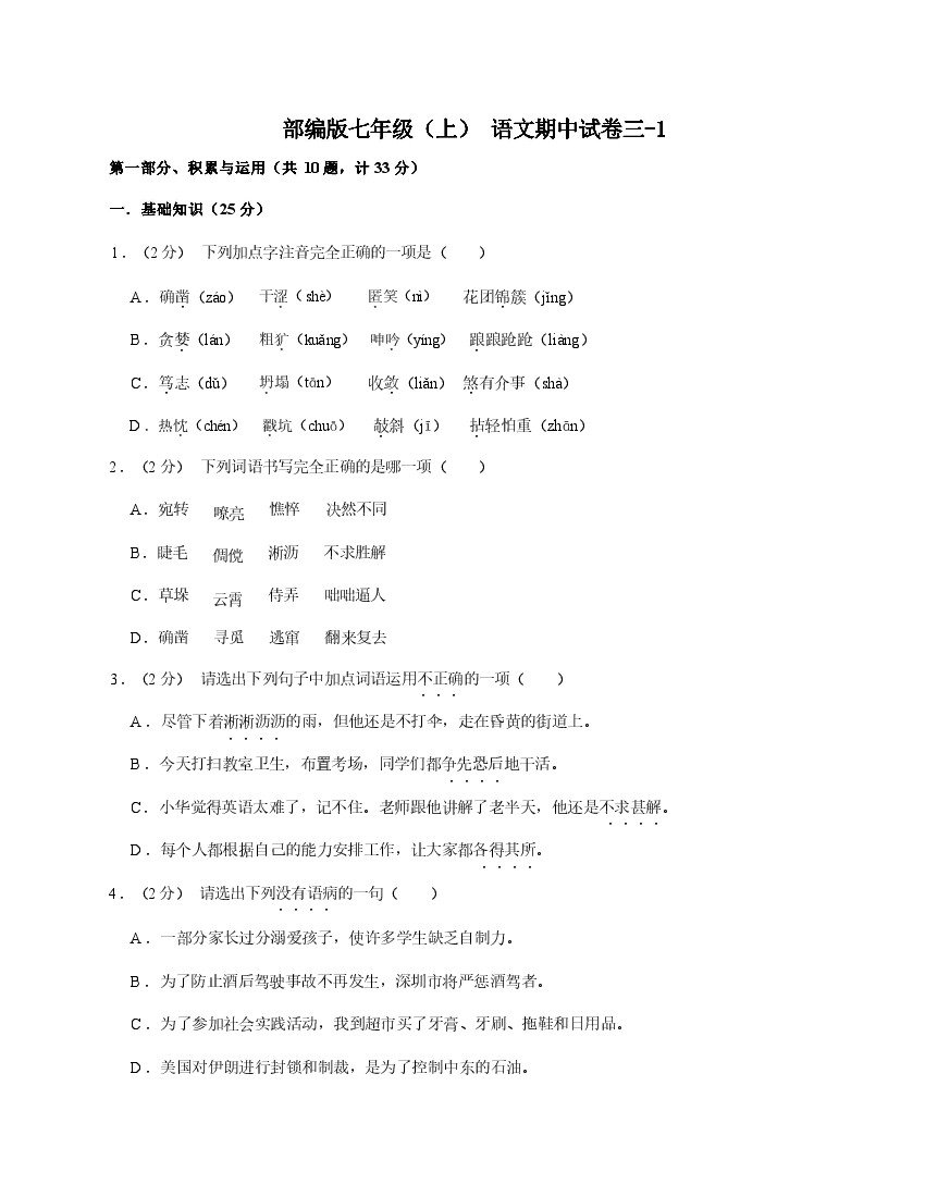 七年级(上)语文期中试卷3-1卷部编版