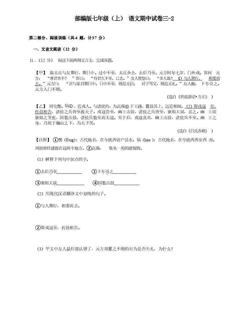 七年级(上)语文期中试卷3-2卷部编版