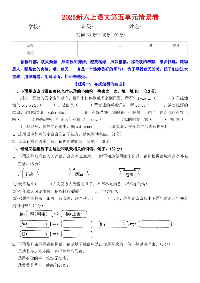 六年级上册 语文第一单元提升冲关测试卷部编版(含答案)