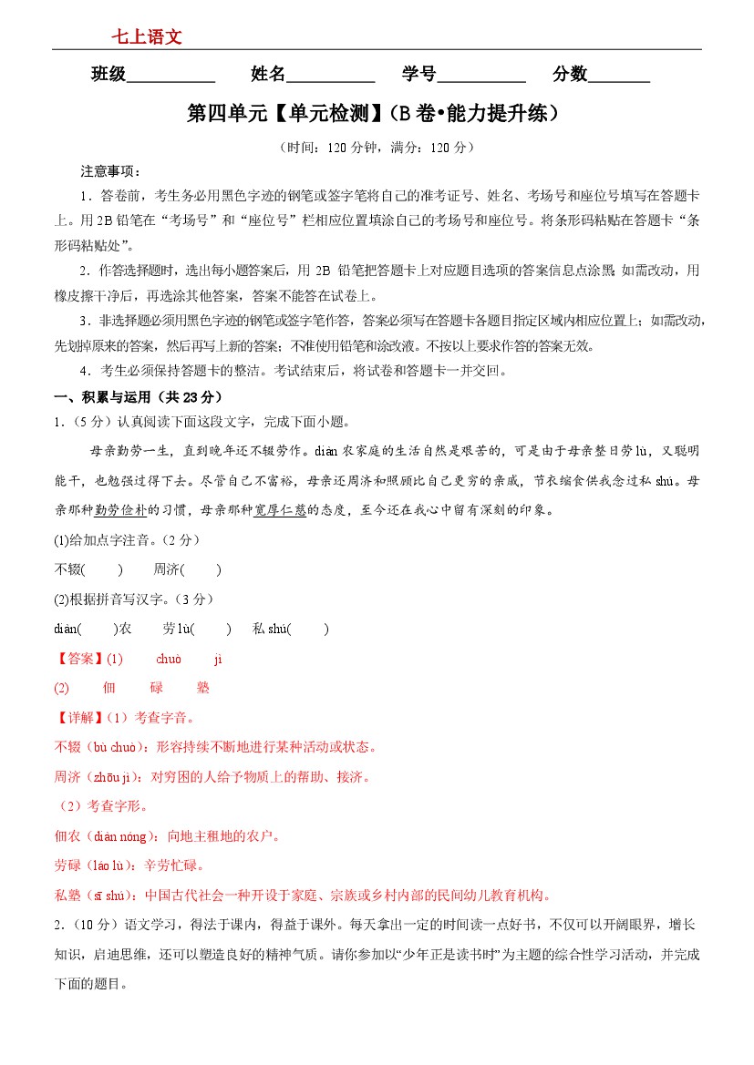 【七上语文】第四单元【2025版单元检测】(B卷•能力提升练)(解析版)