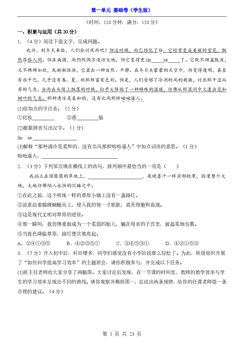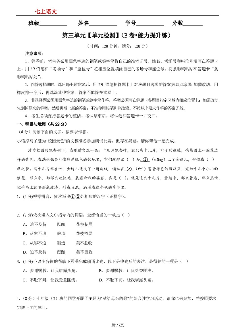 【七上语文】第三单元【2025版单元检测】(B卷•能力提升练)(原卷版)