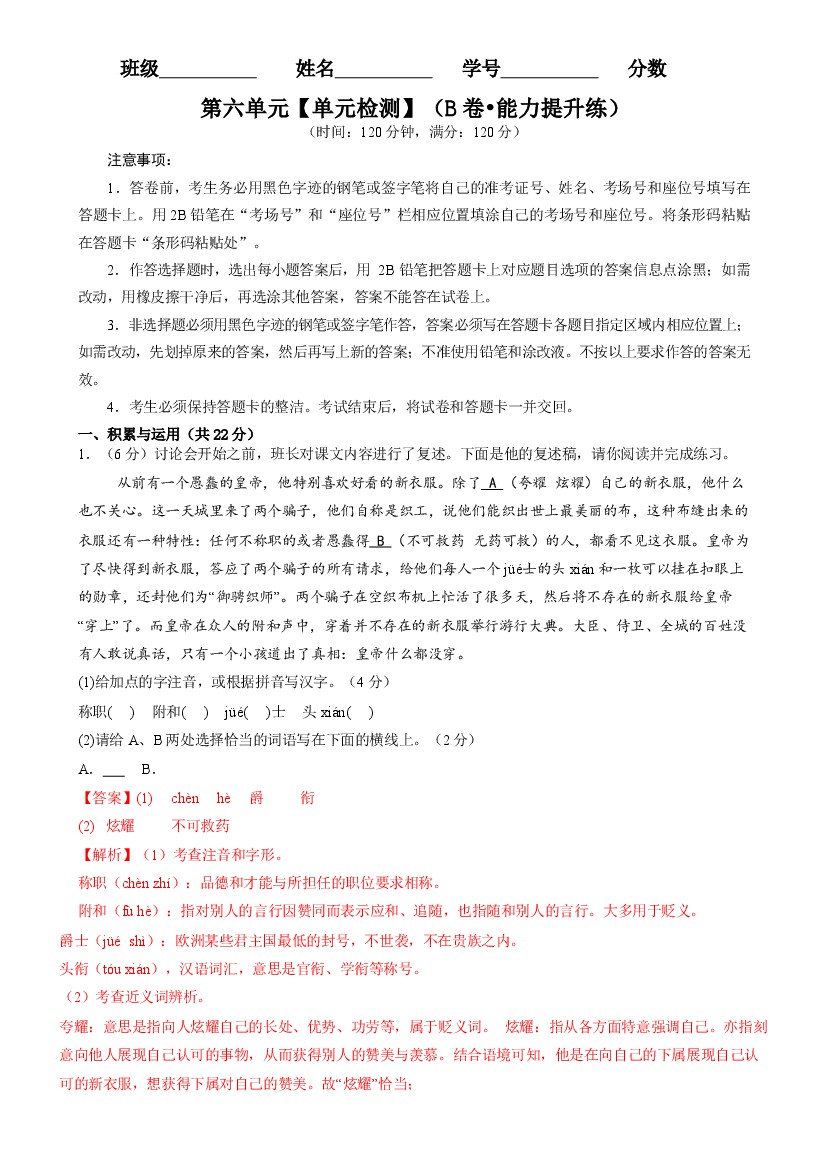 【七上语文】第六单元【2025版单元检测】(B卷•能力提升练)(解析版)