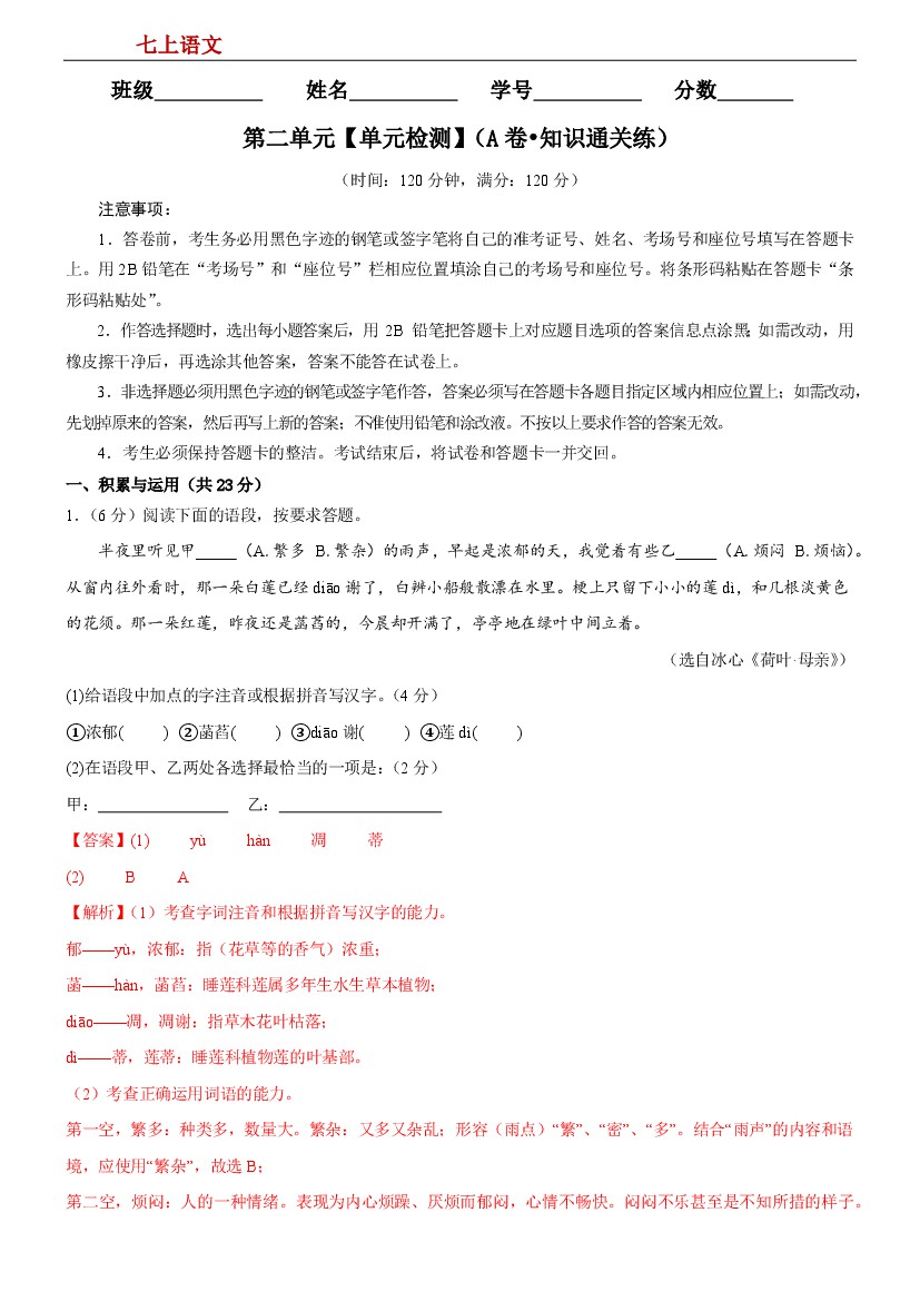 【七上语文】第二单元【2025版单元检测】(A卷•知识通关练)(解析版)