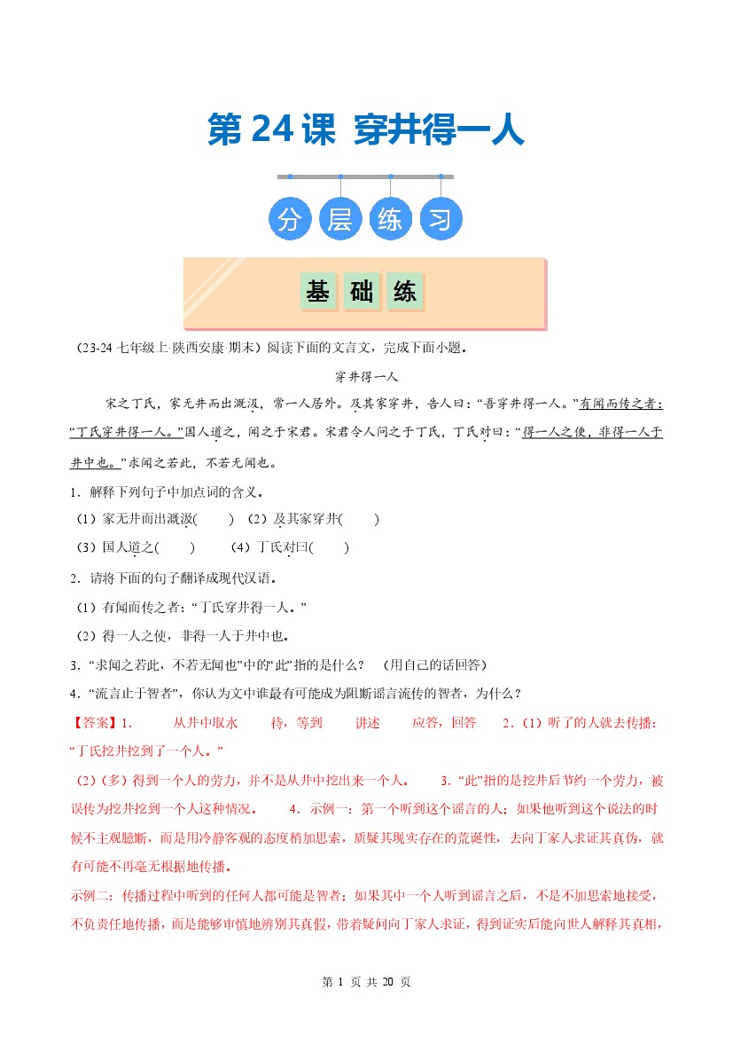 25年秋七年级上册语文同步练习第24课 《穿井得一人》(分层作业)(解析版)