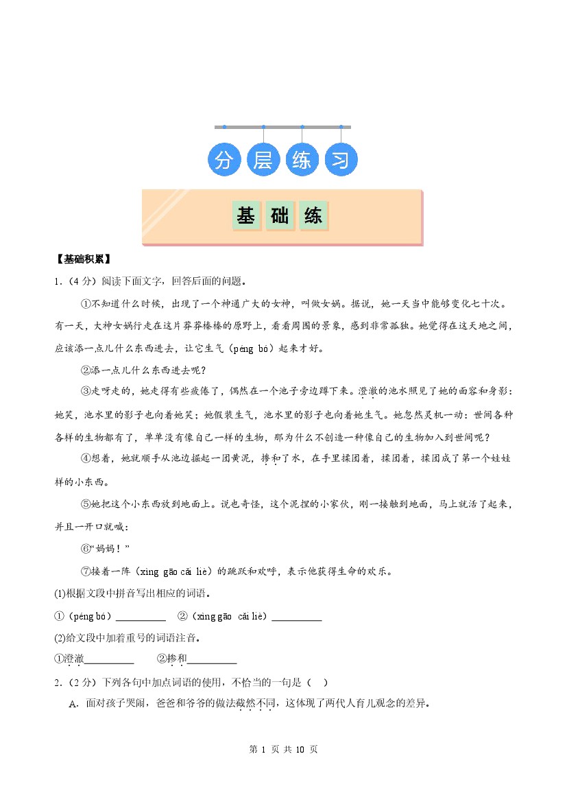25年秋七年级上册语文同步练习第23课 《女娲造人》(分层作业)(解析版)