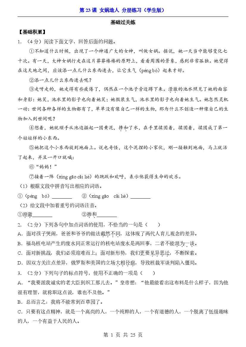 25年秋七年级上册语文同步练习第23课 《女娲造人》(分层作业)(原卷版)