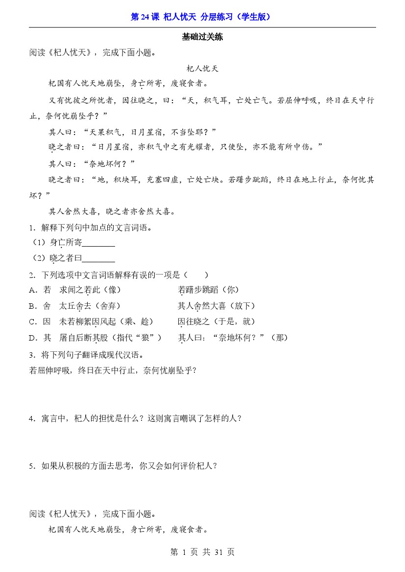 25年秋七年级上册语文同步练习第24课 《杞人忧天》(分层作业)(解析版)
