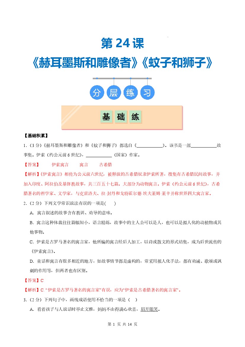 25年秋七年级上册语文同步练习第24课 《赫尔墨斯和雕像者》《蚊子和狮子》(分层作业)(解析版)