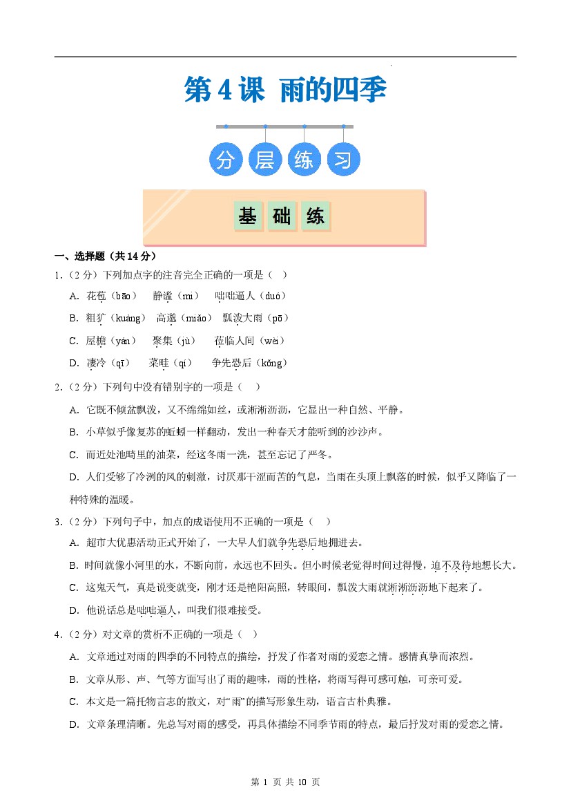 25秋七年级上册语文同步练习第3课 《雨的四季》(分层作业)(原卷版)