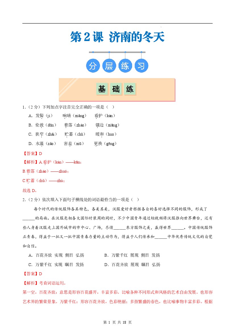 25秋七年级上册语文同步练习第2课 《济南的冬天》(分层作业) (解析版)