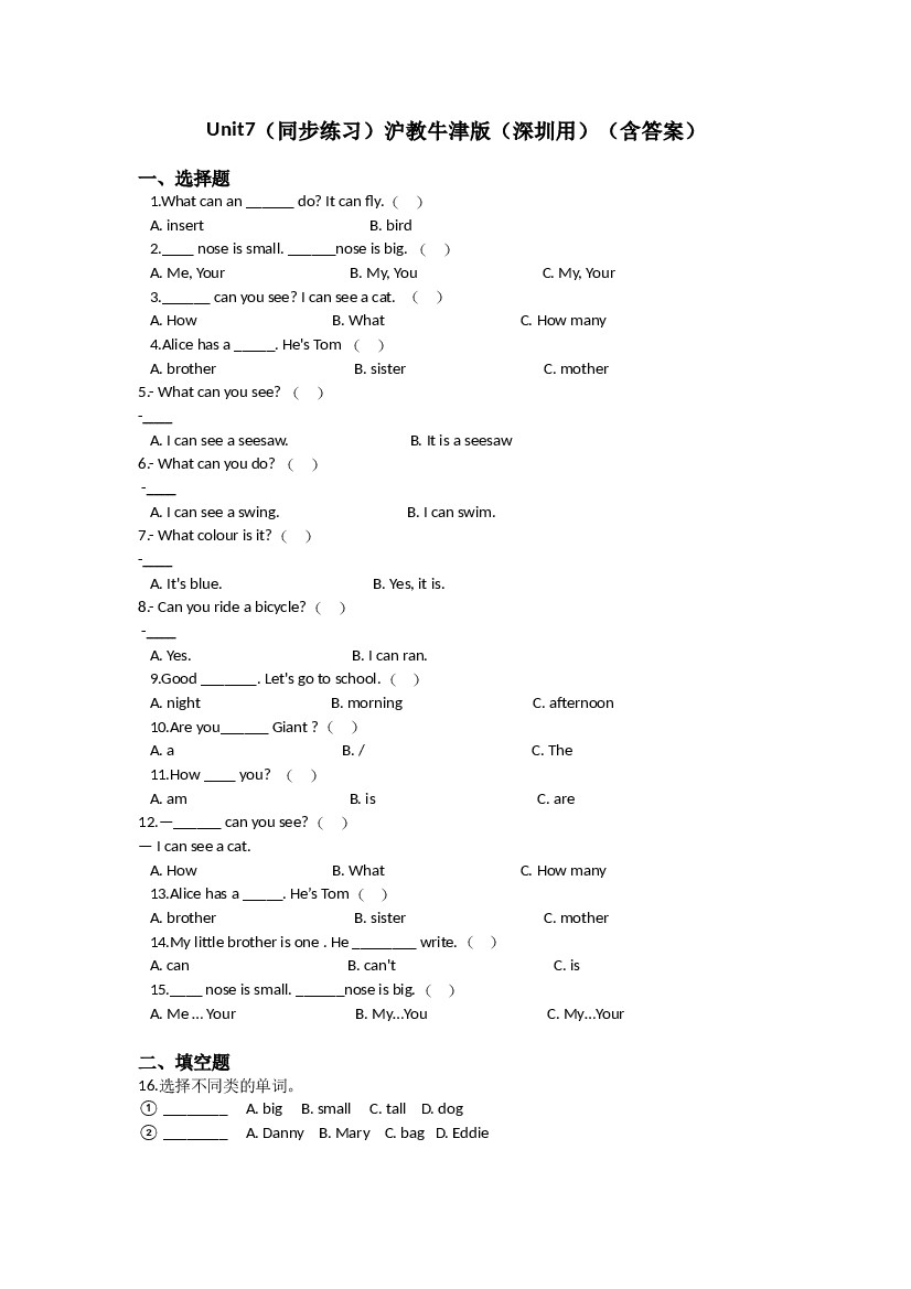 Unit 7 In the playground(同步练习)-二年级英语上册-沪教牛津版(深圳用)(含答案)